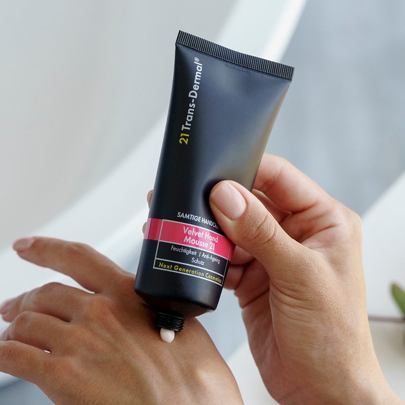 Nach Bedarf. Eine kleine Menge Velvet Hand Mousse 21 auftragen und einmassieren.
